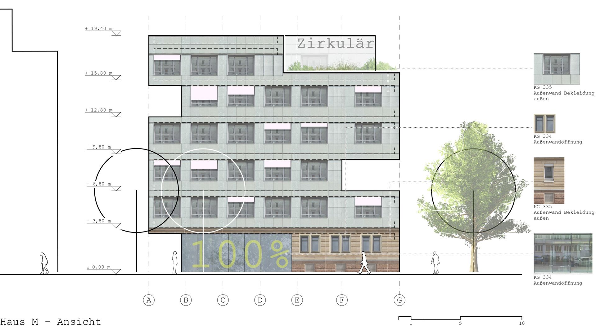 Wir konnten den Auftraggeber davon überzeugen, das Vorhaben als Reallabor für zirkuläres Bauen zu nutzen. Dabei werden durch ein Pre-Demolition-Audit Bauteile und Materialien aus baufälligen Gebäuden des Areals identifiziert. Diese sollen in das neue Gebäude integriert werden, um einen möglichst hohen Recycling-Anteil zu erreichen.